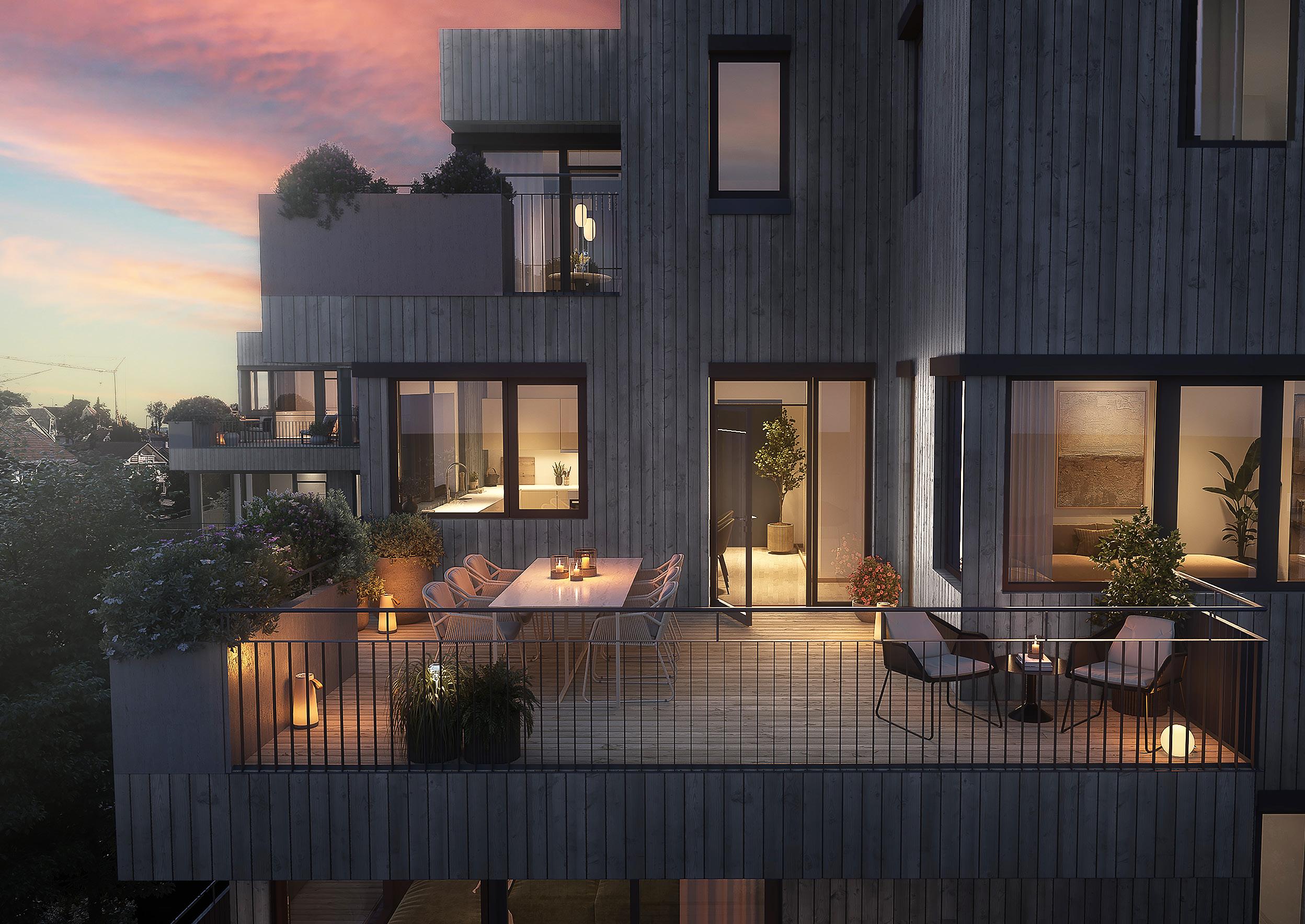 Store, flotte balkonger med plantekasser og gode solforhold. Alle leilighetene ligger på hjørner, noe som gir flott lys fra flere sider.