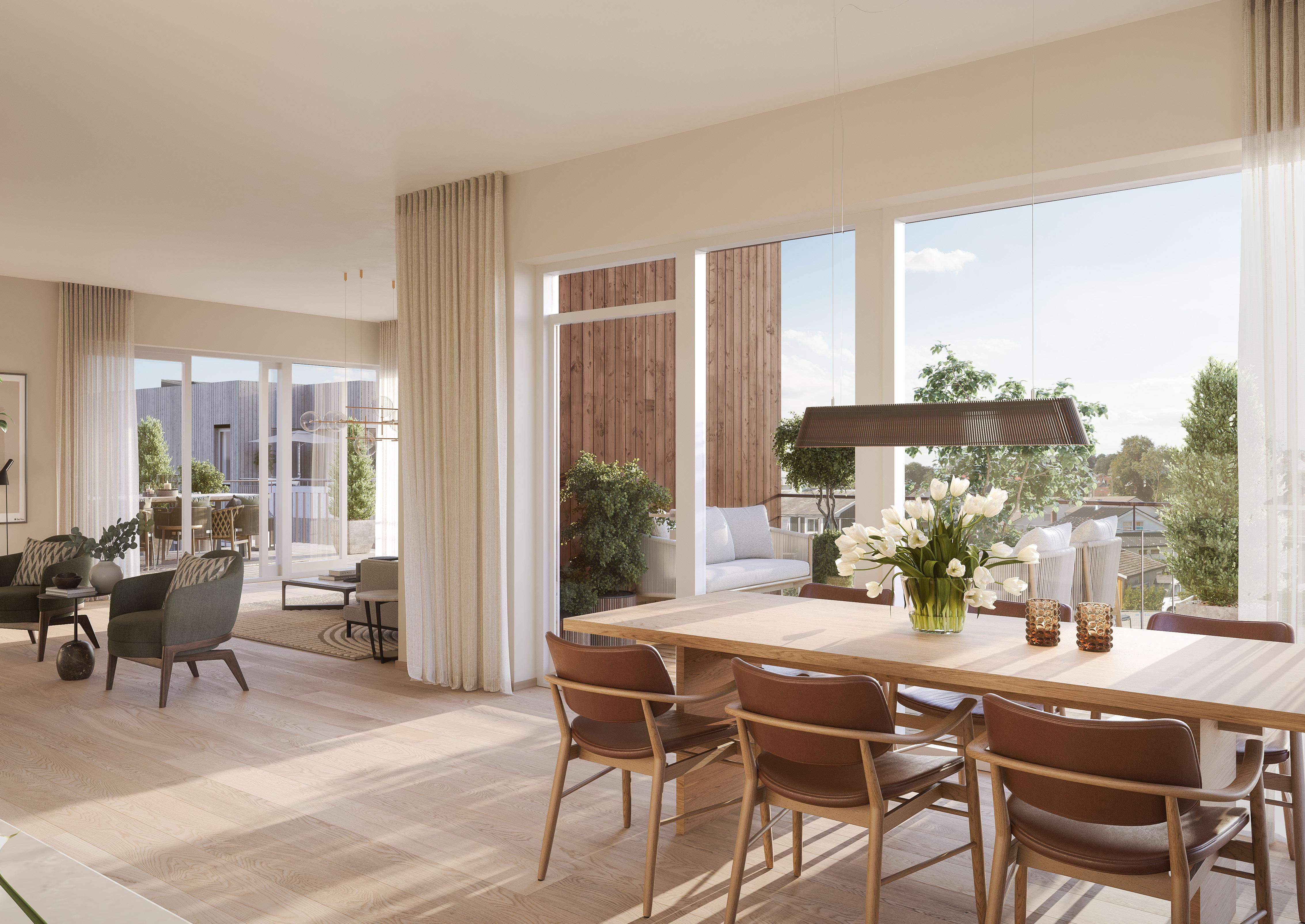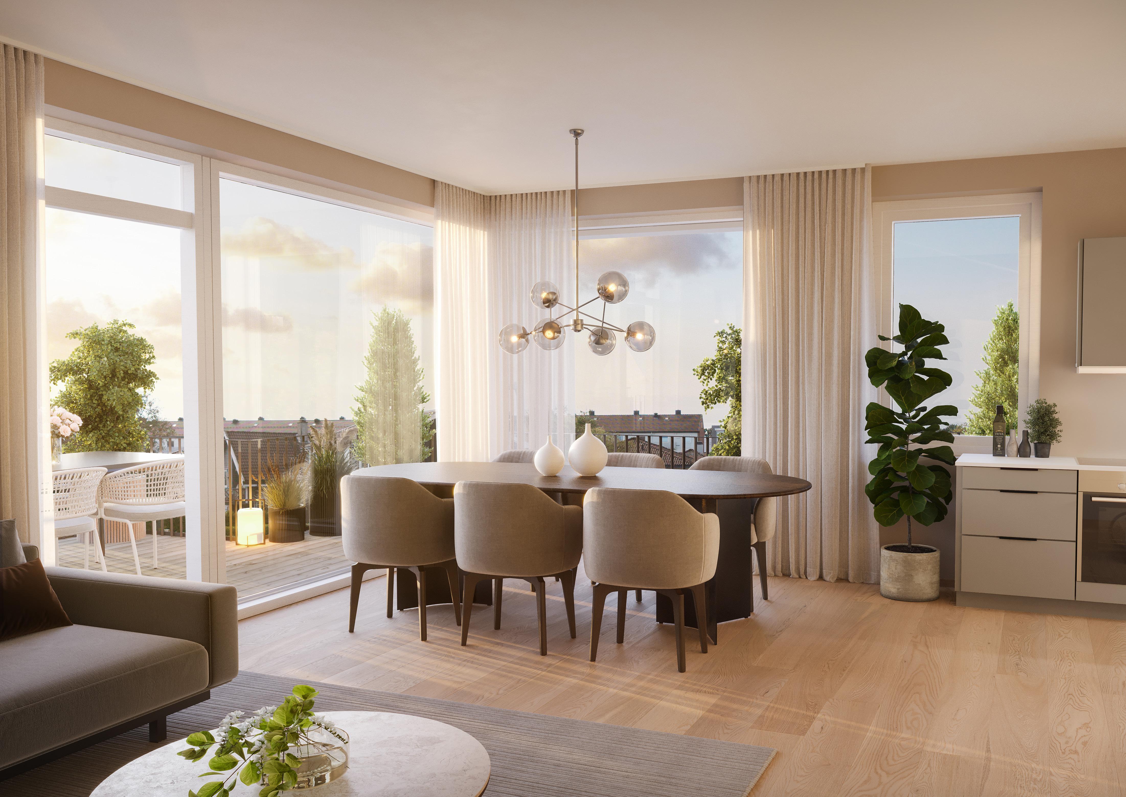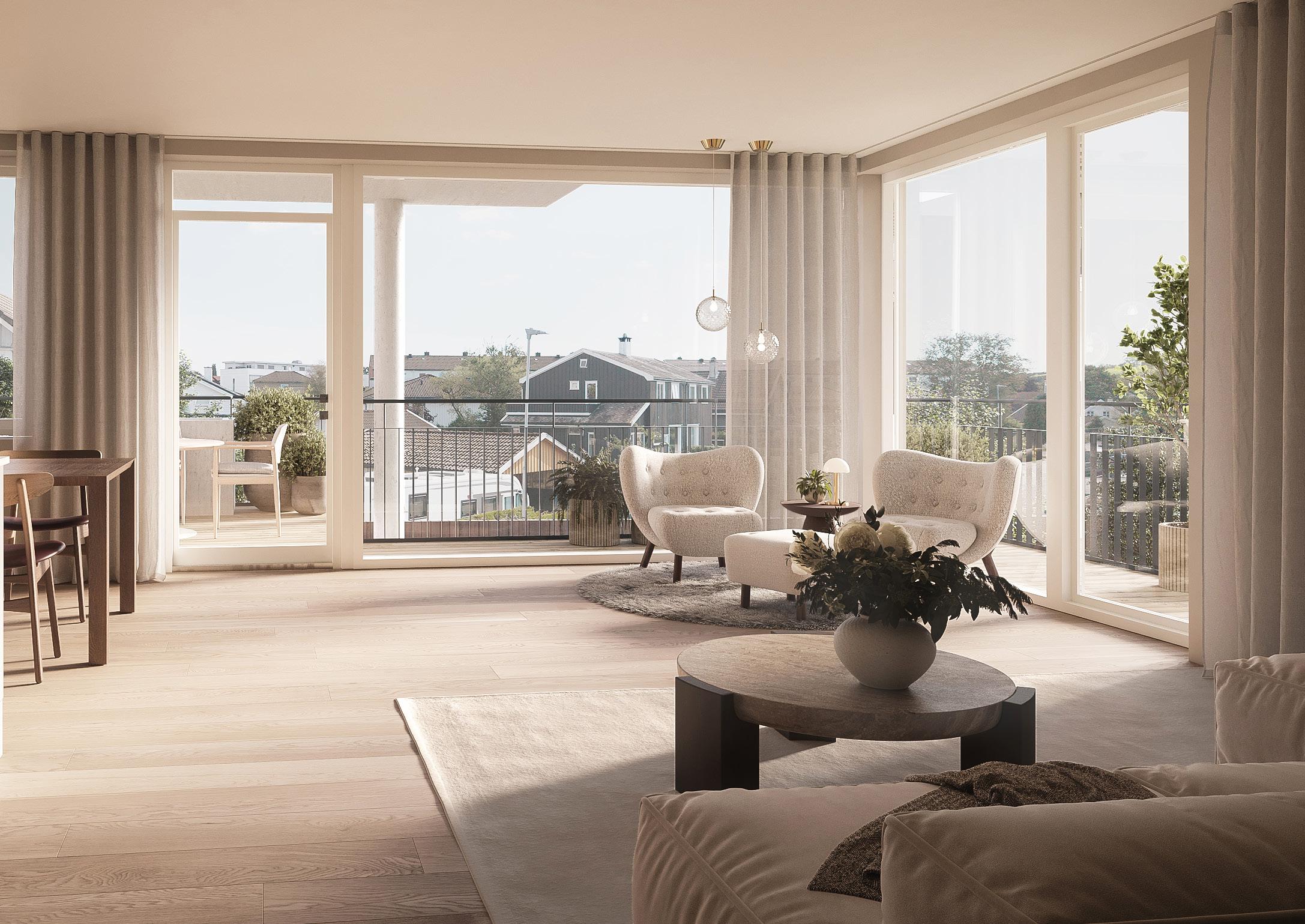 Alle leilighetene ligger på hjørner og har store vinduer som gir lyse og luftige rom. Elegante, listefrie overganger mellom vegg og vindu gir et ekstra eksklusivt preg.