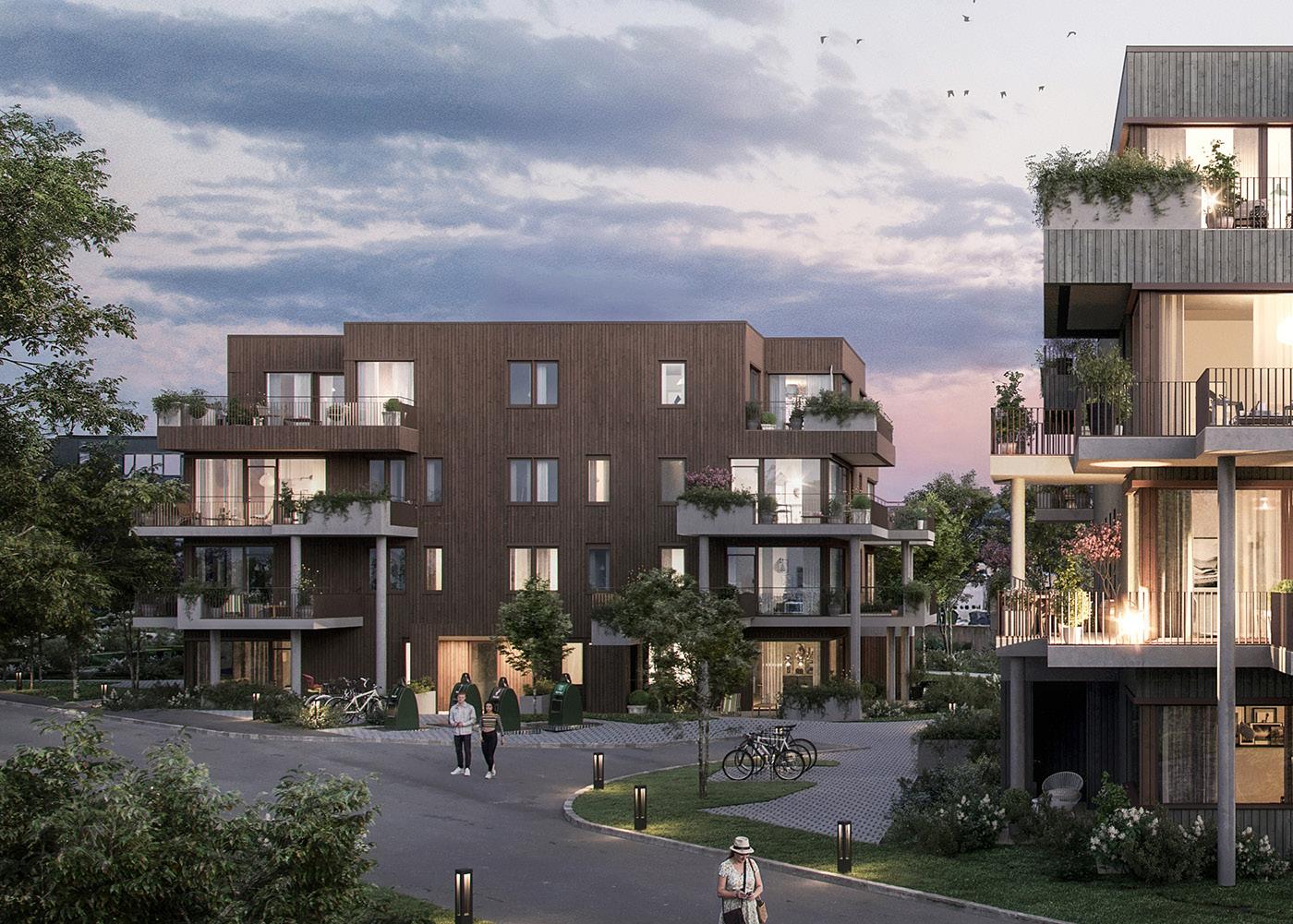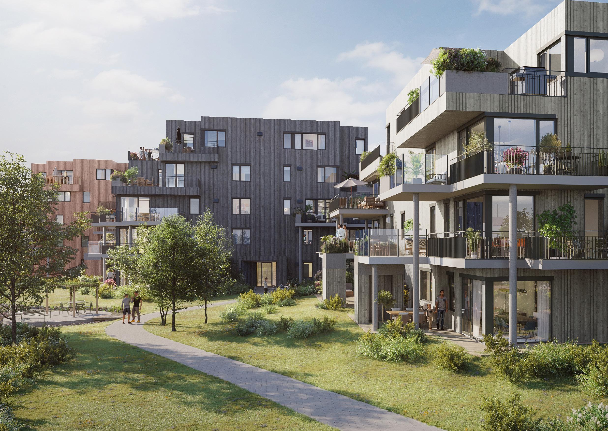 De to siste byggene i trinn 2 – D og E – ligger lekkert til mot det nye parkområdet som kommer i enden av Hinnavågen 9. 3D-illustrasjon.