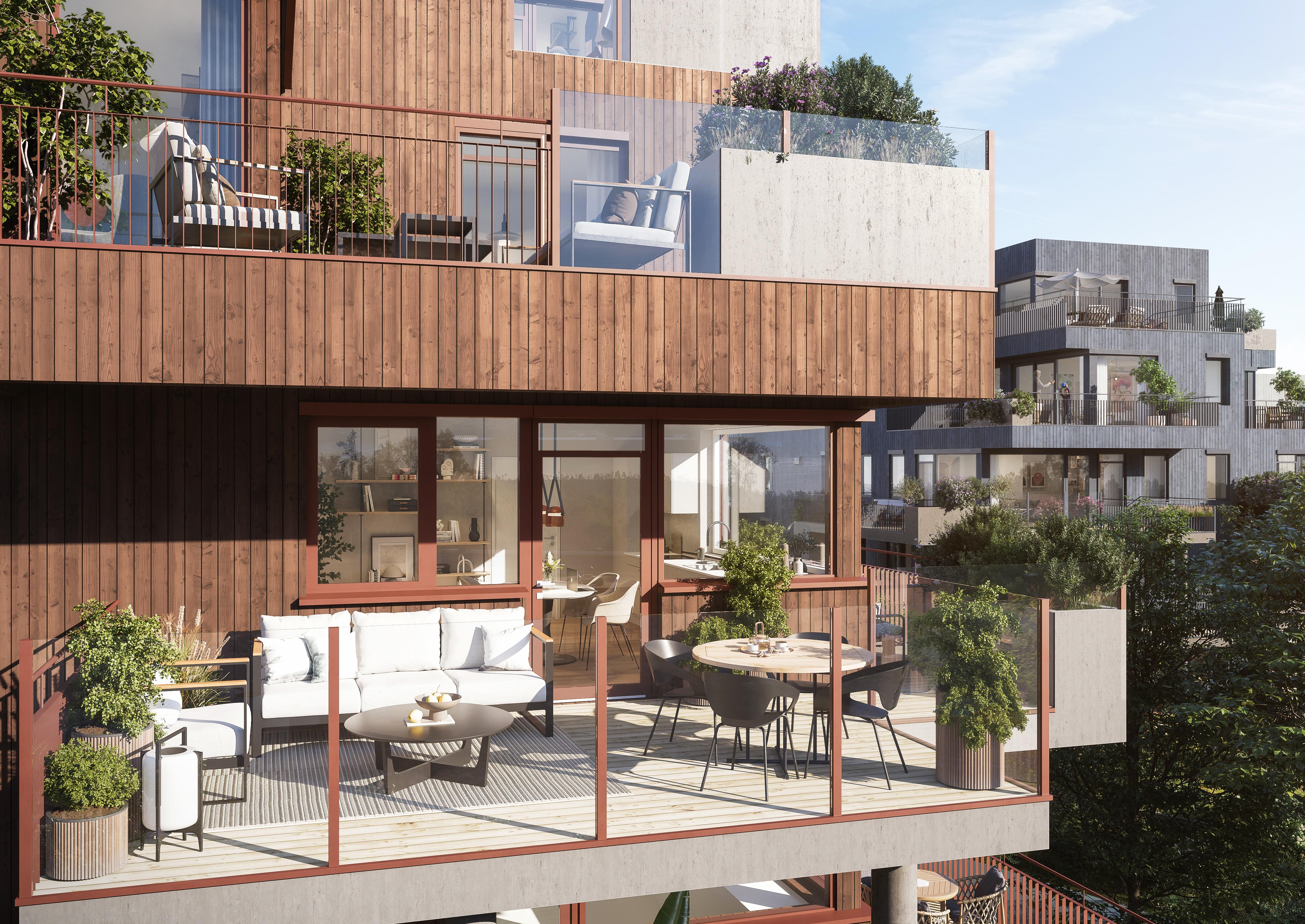 Hver leilighet har sin egen unike utendørs oppholdsplass utstyrt med en integrert plantekasse for dyrking av alt fra busker til mindre trær. De rause uterommene har flere møblerbare soner, både overdekkede og åpne soner. Med sin betydelige utstrekning gir de private uteplassene mulighet til en sømløs overgang mellom interiør og eksteriør i alle etasjer.