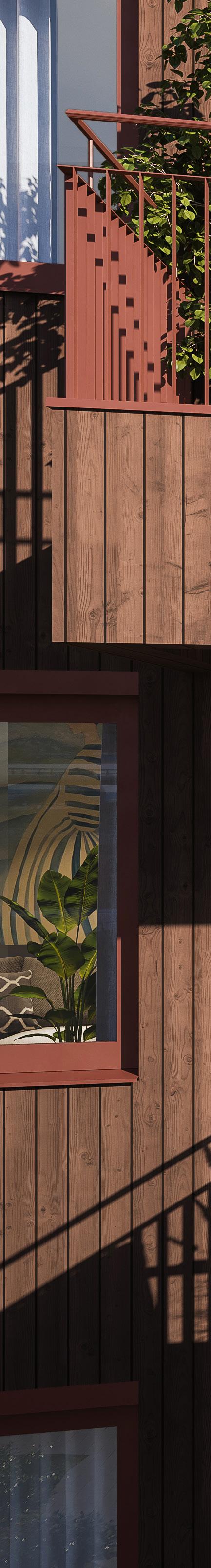 Bygningene er kledd i tre og har ulike fargetoner som knytter dem til småhusbebyggelsen på Hinna og trehustradisjonen i regionen.