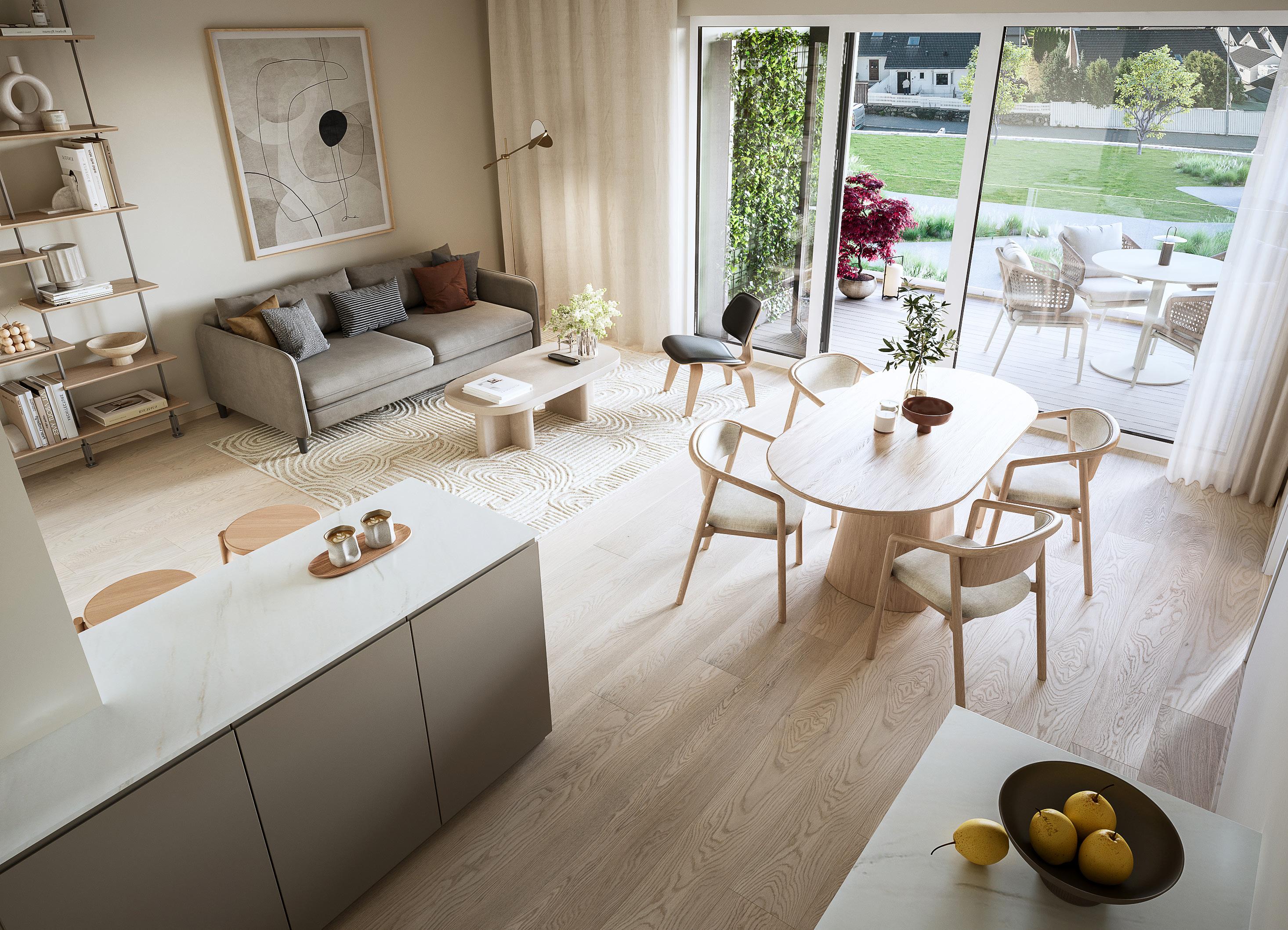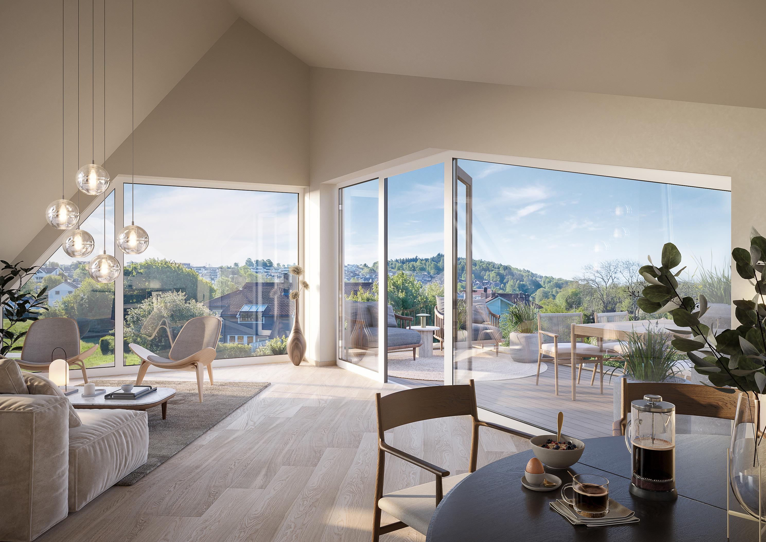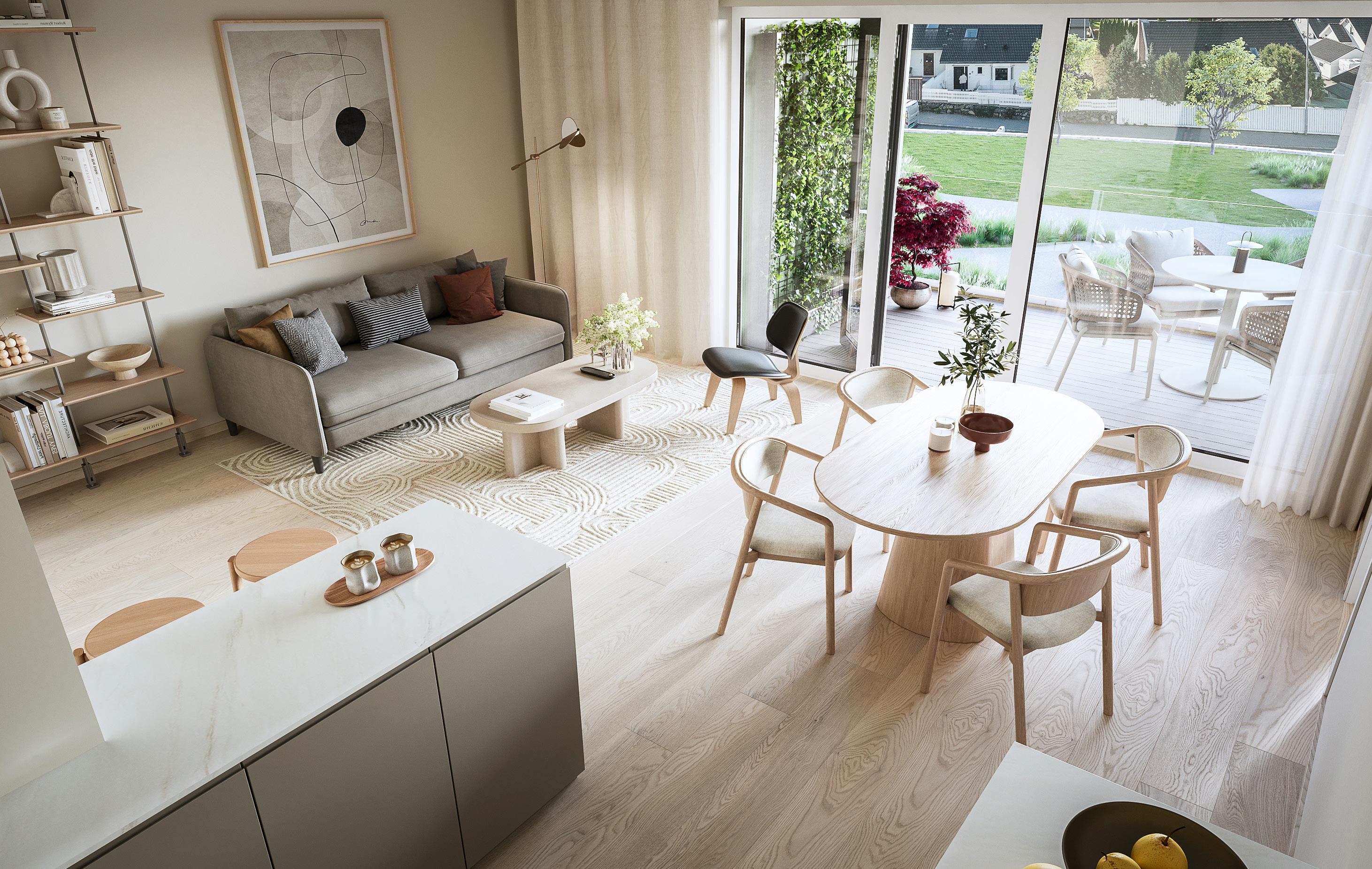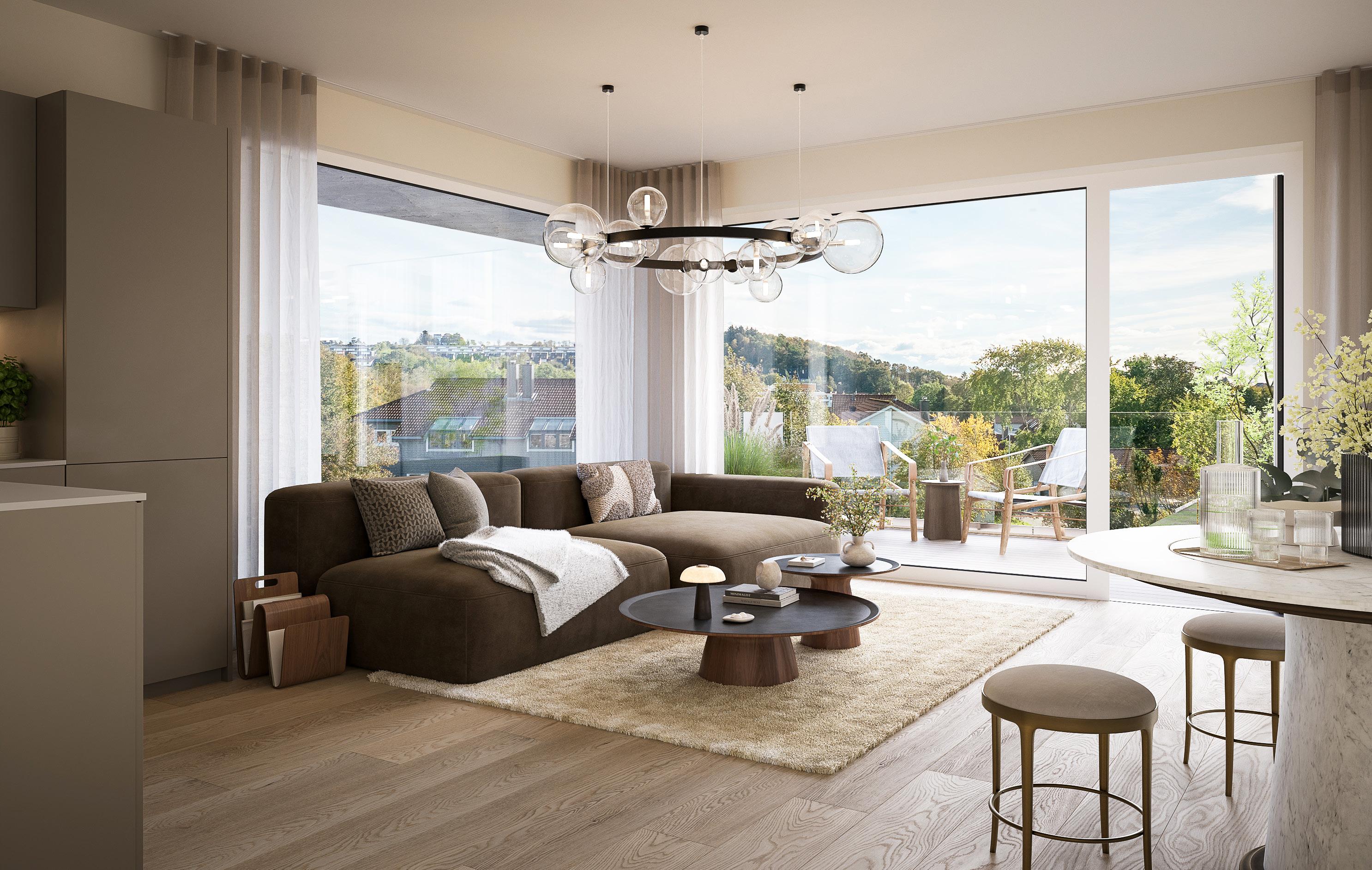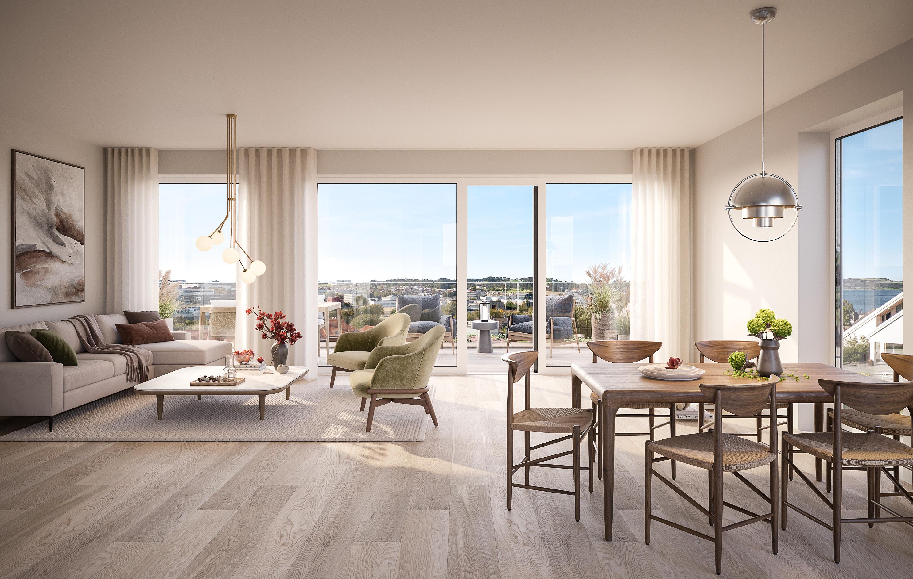 Leil. B-405. Samme planløsning for B-305. Utsikten vil variere ut fra etasje. 3D-illustrasjon. Avvik kan