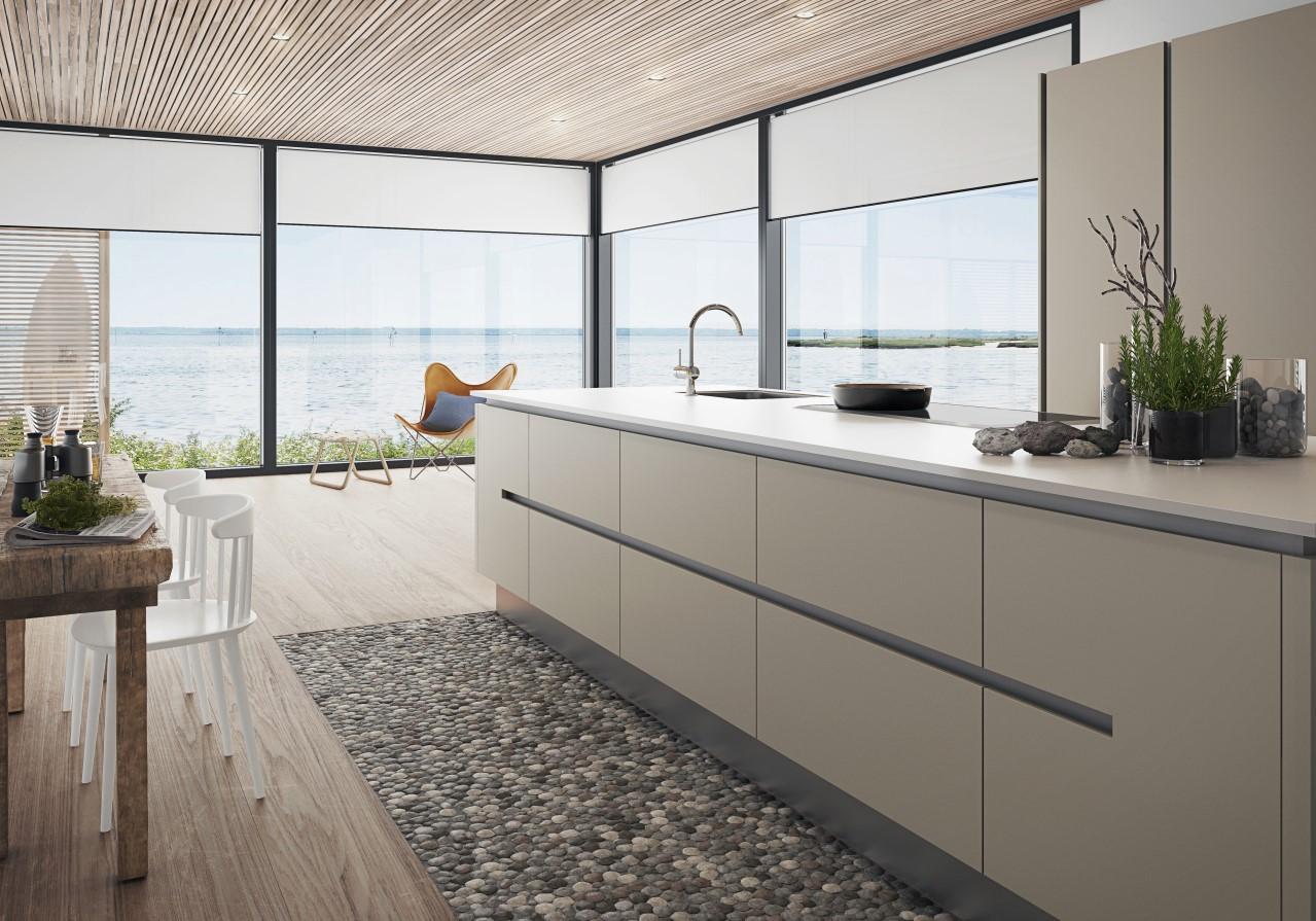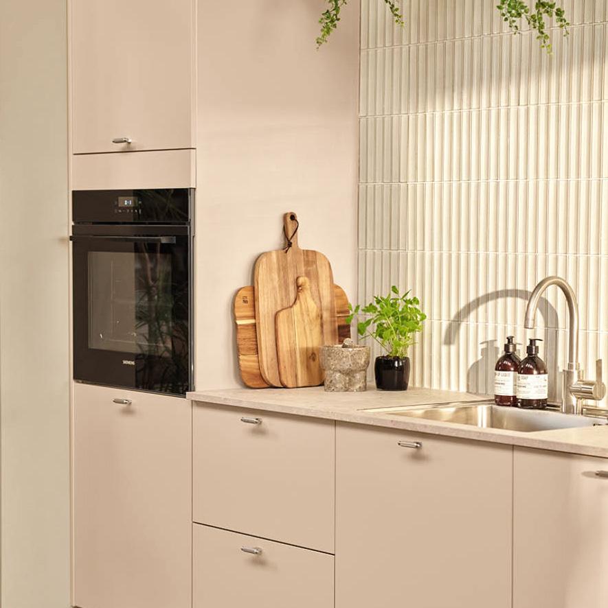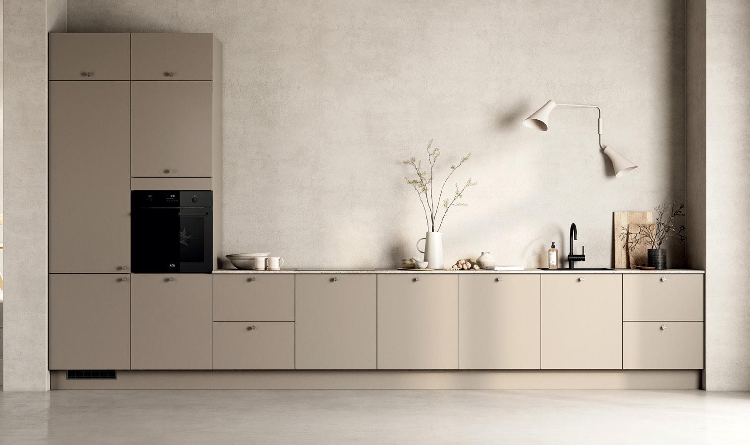 Kjøkkeninnredning fra HTH som gir mulighet for flere fargevalg på fronter (og skrog) uten pristillegg for kunde. Front til integrert oppvaskmaskin.