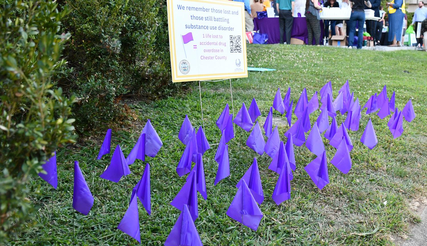 Courtesy photo Purple flags honor those lost to overdose deaths. In 2025, Chester County saw a 20-percent decline in overdose deaths from 2024.
