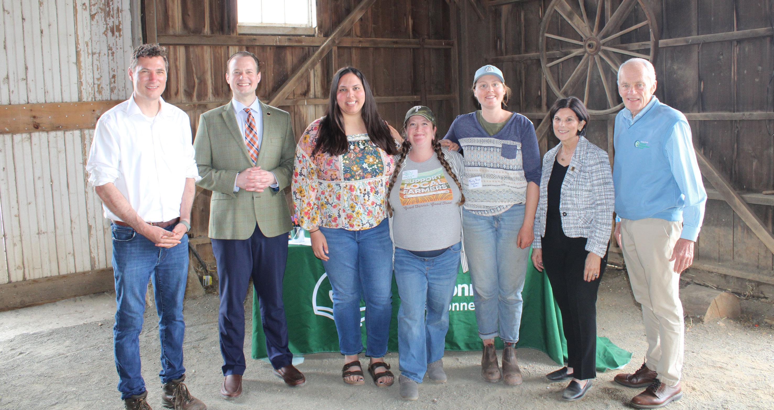 Pictured are, from left, Board of Commissioners chair Josh Maxwell, commissioner Eric Roe, Community Impact in Agriculture winner Christy Campli of Growing Roots Partners, Woman in Agriculture winner Samantha Smenkowski-Heacock of Full Circle CSA, Young & Emerging Person in Agriculture winner Becky Brett of Toad Stop Farm, commissioner Marian Moskowitz, and Chester County Economic Development Council CEO Gary Smith.