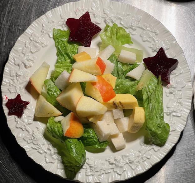 As each course was brought out, Hazzard explained what it was. The meal, which lasted more than two hours, began with parsnip and oregano fritters, followed by caramelized rutabaga and honey soup, and a third course of an Irish Flag salad.