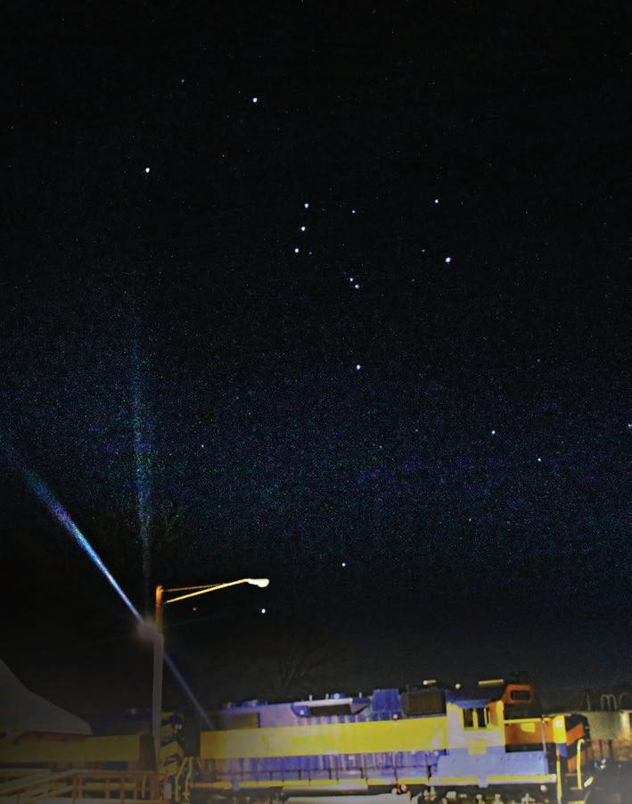 Orion the Hunter, the prominent winter constellation, looks down on the East Penn train engine on a cold, clear winter evening in Kennett Square. This photo was taken in January.