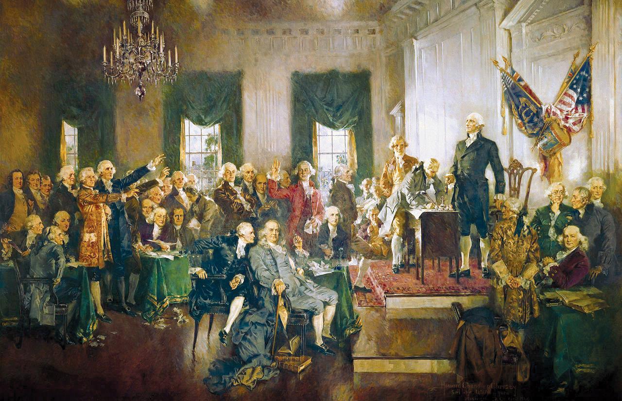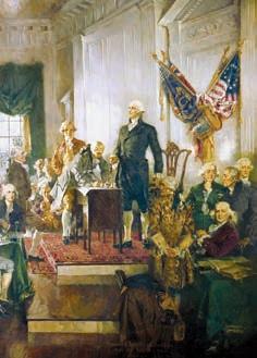A scene at the signing of the Constitution of the United States by Howard Chandler Christy.