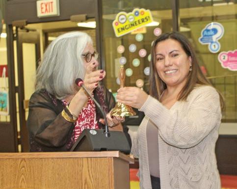 Photo by Chris Barber Kennett School Board member Lenda Carillo, right, receives the gift of a small school bell from board vice president Vicki Gehrt in honor of Carillo’s work on the board. Carillo is resigning from