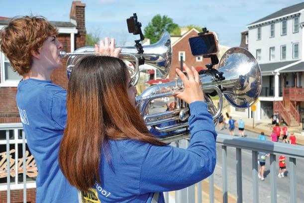 Members of the Kennett High School Marching Band entertained runners along State Street in Kennett Square from the Melton Terrace at the Kennett Library.