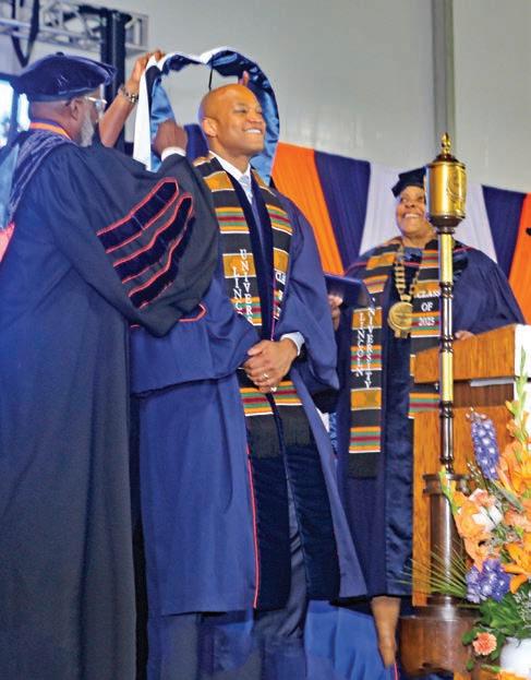 Maryland Gov. Wes Moore is presented with regalia designating him with an honorary doctorate at Lincoln University’s Commencement on May 4. At right is Lincoln University President Dr. Brenda Allen.