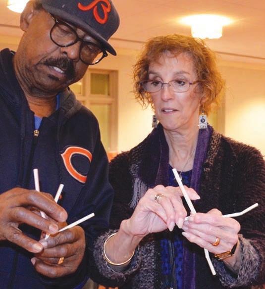 Reba Strong works with Jeff Thaxton on using straws that are knotted together, but they penetrate each other and come apart.