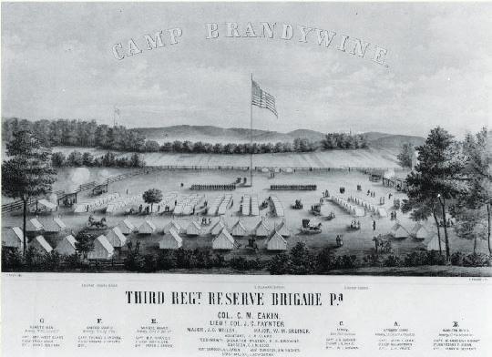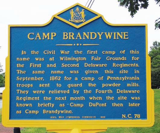 BRANDYWINE– In the Civil War the first camp of this name was at Wilmington Fair Grounds for the First and Second Delaware Regiments. The same name was given this site in September 1862 for a camp of Pennsylvania troops sent to guard the powder mills. They were relieved by the Fourth Delaware Regiment the next month when the site was known briefly as Camp du Pont, then later as Camp Brandywine.”