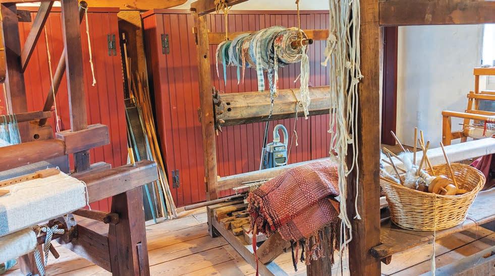 Throughout the year, Greenbank Mill displays multiple sizes and styles of carding equipment, used to untangle fibers and ensure them running in the same direction. The Fiber Guild meets regularly at the mill to work on assorted looms and spinning wheels.
