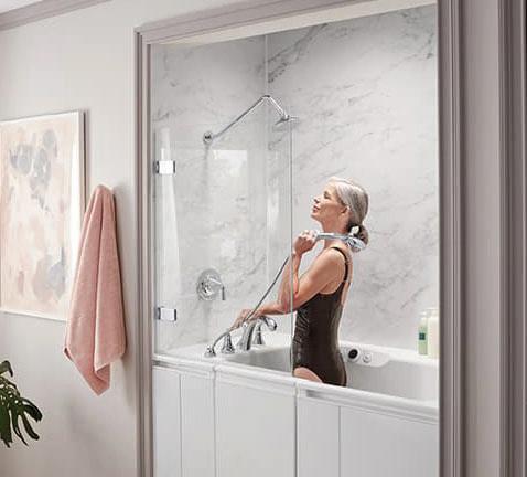 Home Smart Industries is the areas only Authorized Dealer of Kohler’s crushed stone shower wall system made of 70% real crushed marble and professionally installed at prices comparable to acrylic showers. Don’t cover your problem up with a tub or shower liner. Design your bathtub or shower replacement with our