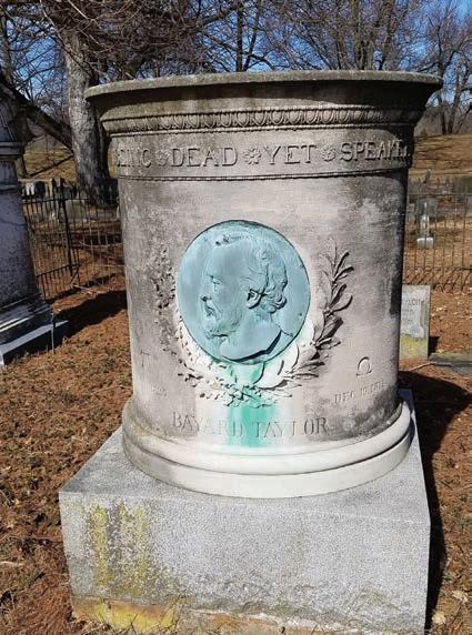 Continued on Page 66 (1854) which served as the home of the Pennsylvania Yearly Meeting of Progressive Friends. The cemetery and meetinghouse were built on land owned by John and Hannah Cox, who were actively involved with the Underground Railroad in the Kennett Square area. Black Civil War soldiers, doctors and nurses who cared for the wounded were laid to rest alongside Quaker abolitionists and “station masters” of the Underground Railroad, including some of Chester County’s most famous leaders like the Coxes, Eusebius Barnard and Isaac and Dinah Mendenhall. Its most famous gravesite is that of Bayard Taylor, a Kennett Square native and well-known 19th century travel author and diplomat. He lies next to his brother, Charles F. Taylor, the youngest Colonel in the Army of the Potomac, who died defending Little Round Top on July 2, 1863 at the Battle of Gettysburg. The Meetinghouse (now the Chester County Visitor’s Center) as well as Bayard Taylor’s nearby home Cedarcroft are on the National Register of Historic Places.