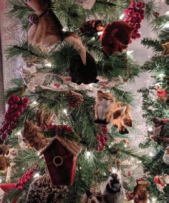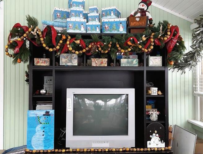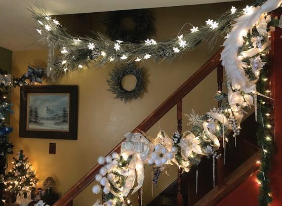 The installation starts with the garlands and the greenery, and then come the lights, ribbons and ornaments. Wall hangings, pictures, wreaths and stockings follow, with items on furniture and shelves and in cabinets next. Trees complete each scene.