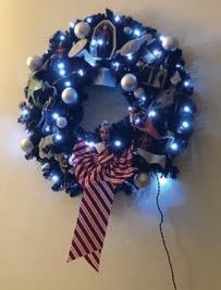 Chase was an early client, interested in decorating a three-season room newly enhanced with heat and air conditioning. Mason asked about theme (winter wonderland) and style (natural ornaments), and he sent her shopping. On the appointed day, he came to create with family favorites, new purchases and his supply of tools and hardware.