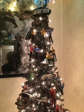 Christmas linens, plates, glasses and serving pieces replace the non-holiday kind. The covers of Christmas cookie tins become burner covers on the stove. Christmas cards are displayed and are recycled to decorate gifts. A bust of Zeus is costumed to become the ghost of Christmas present.