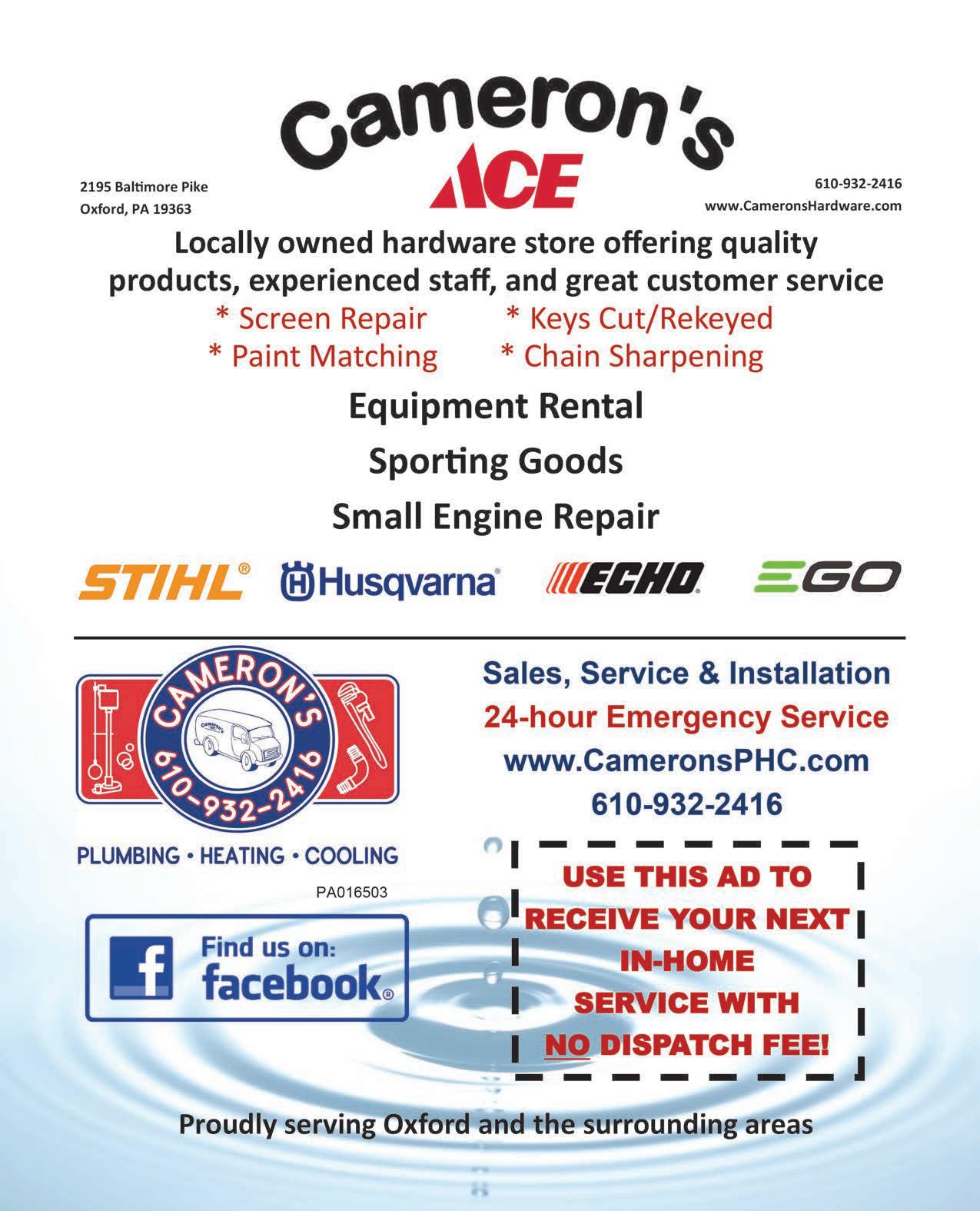 This spring, visit Cameron’s Ace Hardware’s newly expanded Garden Center and meet Cindy, our plant expert. We have seeds, vegetables and a large selection of flowering plants. Cindy has great ideas to assist you in your plantings and garden projects. Angie Thompson- Lobb Cameron’s Ace Hardware 2195 Baltimore Pike, Oxford, PA 19363 610-932-2416