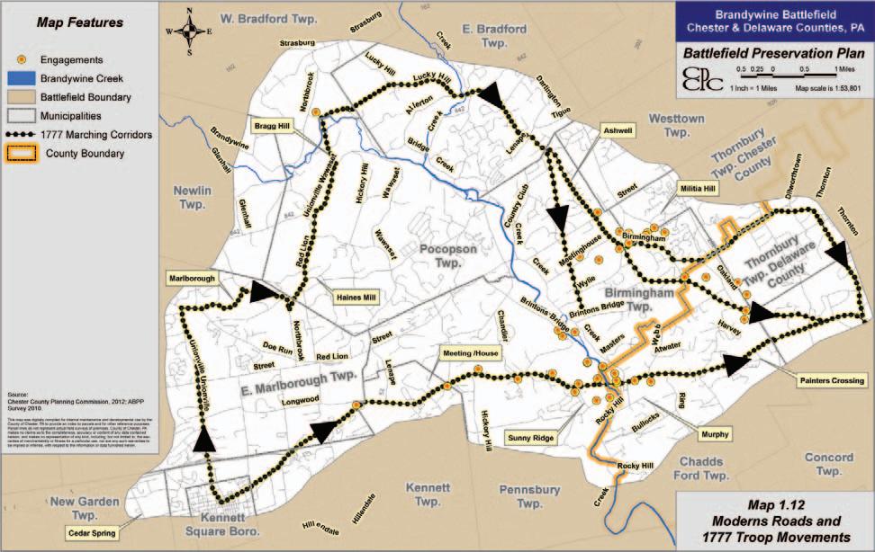 The complexity of the task is obvious. The battlefield extends across 15 municipalities and two counties. Much of the property is prime residential land, and thousands of properties are scattered across the historic area. The first three published plans focus on small areas within the region: ‘‘Behind the Lines: Marshallton Strategic Landscape Plan”; “Breaching the Fords and the British Advance: Trimble’s & Jefferis’ Ford Strategic Landscapes Plan”; and “Preparing for Battle: Sconnelltown & Strode’s Mill Strategic Landscape Plan.” The plans were prepared by Chester County Planning Commission with the assistance of John Milner Associates. They were largely funded through a grant to Chester County from the Department of the Interior, National Park Service’s American Battlefield Protection Program (ABPP).