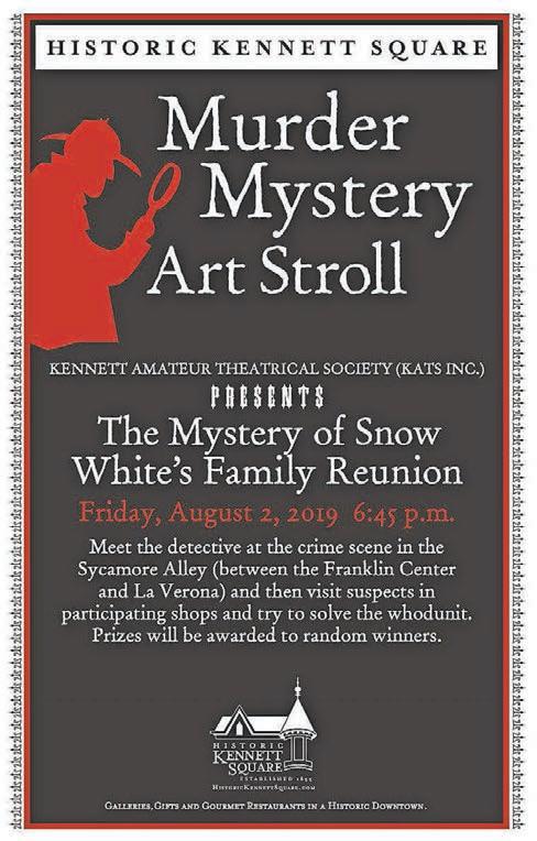 Downtown Kennett Square will be the setting for an audience-participation murder mystery on Aug. 2, presented by the Kennett Area Theatrical Society. Participants meet the detective at the scene of the crime in Sycamore Alley (between La Verona and the Franklin Center) to gather clues, question murder suspects in participating downtown locations, and attempt to identify the murderer and solve the mystery. Prizes will be awarded to random winners.
