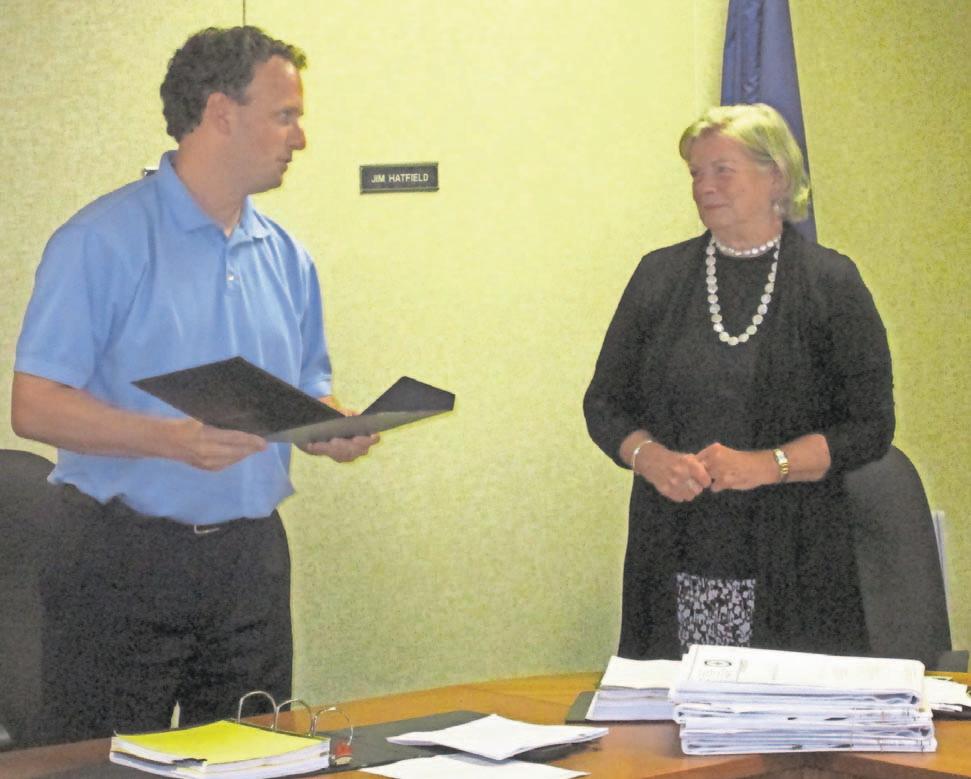 Board of Supervisors chairman Richard Hannum, Jr., presents outgoing Township Manager Jane Laslo with a proclamation in her honor on Aug. 1.