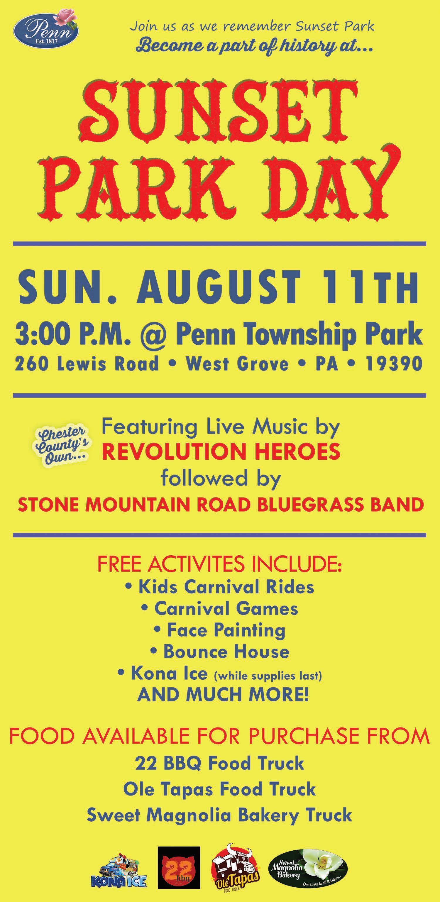 Penn Township Park (260 Lewis Rd., West Grove) hosts Sunset Park Day on Aug. 11 from 3 to 8 p.m.
