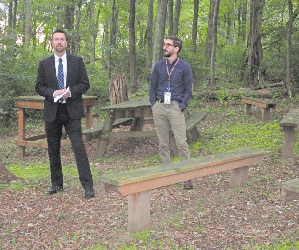 After a walk across a meadow and into a wooded area, Hoffman stood in the Howard T. Smith Outdoor Learning Center, an outdoor classroom with bench seating and a desk that is used for classes studying nature and conservation.