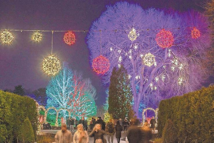 “A Longwood Christmas” will be on display at Longwood Gardens (Route 1, Kennett Square) through Jan. 5. This year’s holiday display is inspired by the contours of traditional holiday favorites, such as poinsettias, pinecones and snowflakes, as well as shapes unique to Longwood. The exhibition Hall holds a 400-foot-long ribbon entwined with giant ornaments, nestled among trees, culminating in a towering Christmas tree decorated in red, gold and silver ornaments. Daily concerts and themed light and fountain shows are scheduled. More than half a million lights are on the trees outside. Admission is by timed admission ticket, purchased in advance for a specific date and time.