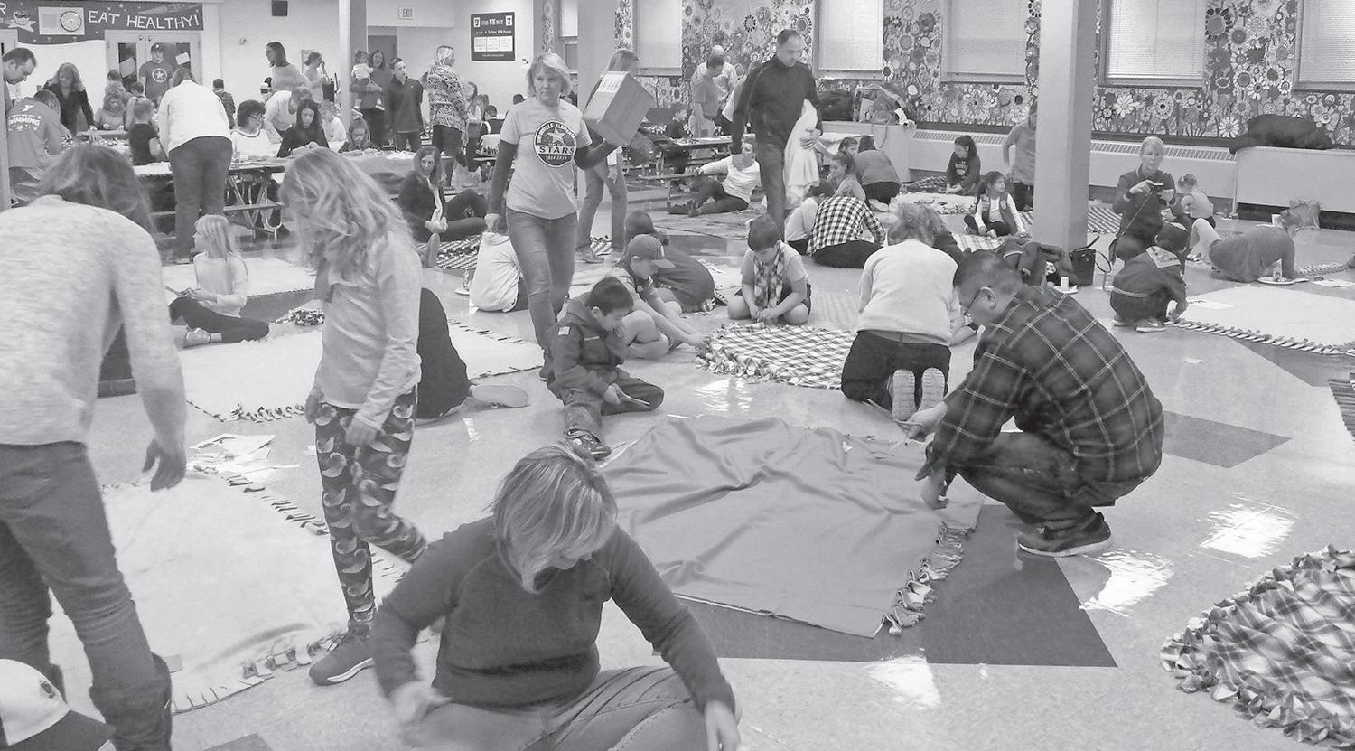 The donated items formed towering stacks on the cafeteria tables as people darted around the room, sorting and boxing everything for distribution. Handmade cards offering messages of hope were slipped into every zip-loc bag. At the same time at Unionville Elementary School, floor space was at a premium in the downstairs cafeteria as families spread out fleece, trimmed the edges and tied the knots together to make soft, cuddly blankets that were going