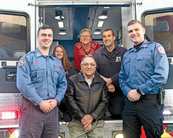 Heart attack survivor Curtis Greer, center, is surrounded by his rescuers weeks later staged in the rear of a local ambulance. From left are paramedic Jake Barnes, EMT Beth Case, Patricia Greer, EMT Mike Syska, and paramedic John Ryan.