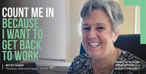 COVID-19 vaccines, and to motivate and inspire people to collectively fight the pandemic. Betsy Huber, the president of the National Grange who lives in Upper Oxford Township, was enlisted to be a part of the effort. In campaign materials, Huber says that she can be counted in on the vaccine “because I want to get back to work.” That’s a sentiment that is certainly shared by millions of Americans.