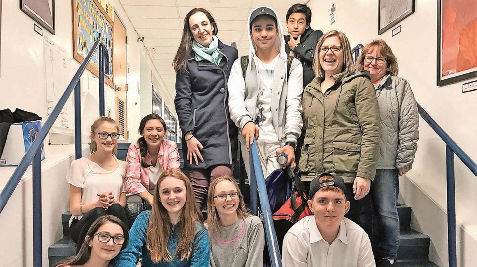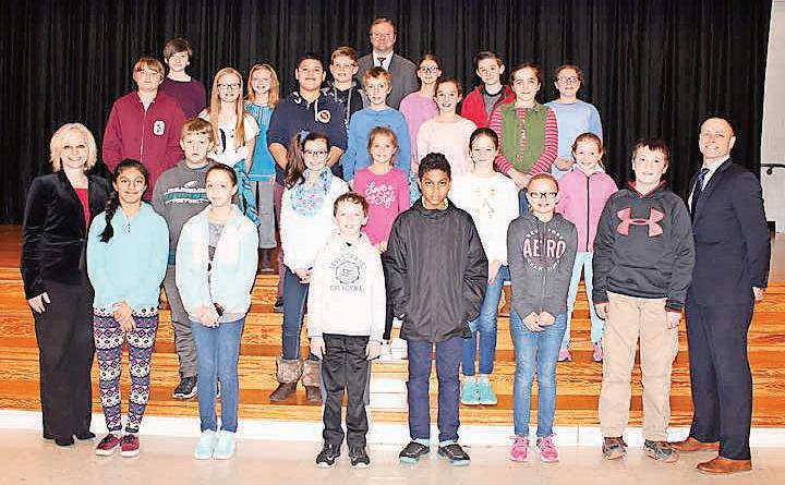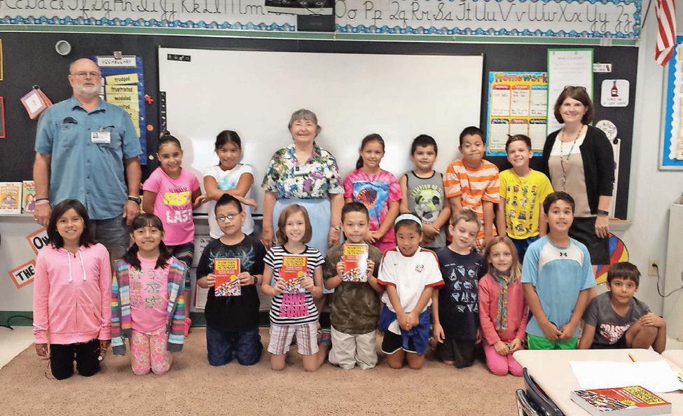 Some members of the third-grade class of Wendy Clendening (back row, right) at Bancroft Elementary School show off their new Spanish-English dictionaries, distributed by London Grove Grange members Ken Pratt (back row left), and Mary Sproat (back row center).