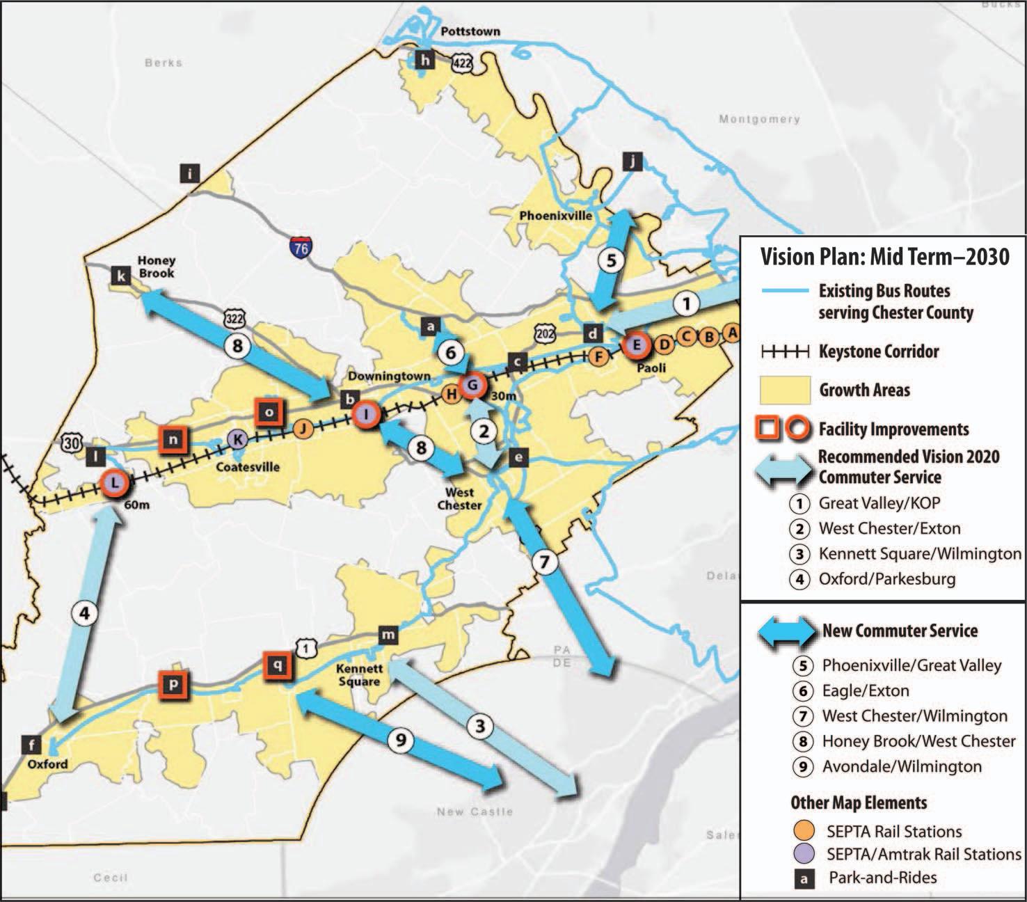 commuter service connections between southern Chester County and New Castle County—one between Kennett Square and Wilmington, another between West Chester and Wilmington, and a third between Avondale and Wilmington—as the population in the area continues to grow in the decades ahead. There could be more and more discussions in Chester County about public transportation.