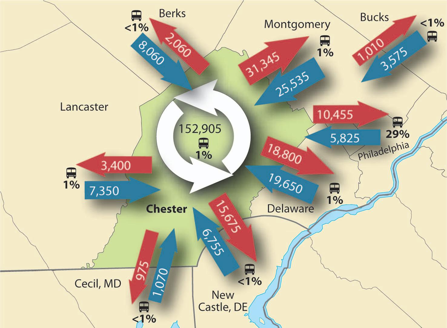 According to Amy Bernknopf, a senior transportation planner with the DVRPC, the commission relied on data from the DVRPC Household Travel Survey and from the U.S. Census to determine where commuters are coming from and going to. Approximately 15,675 commuters travel from southern Chester County