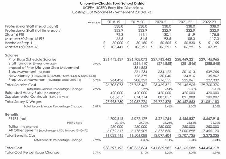 announced at the March 19 school board meeting, and is available online, although the final language is not yet posted. The four-year extension of the collective bargaining agreement with the UCFEA begins on July 1, 2019 and continues through June 30 of 2023. The agreement calls for a 2.99 percent increase in base salaries for the district’s 338 professional staff members. Payment for supplemental contracts would increase Continued on Page 2A