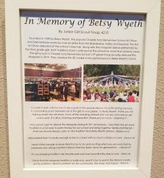 Wyeth, who passed away at the age of 98 last year, began her special connection to the initiation of Chadds Ford Art Show in 1949 and included the story of the May Fair and the debut of the May Pole dance. Each Girl Scout created and painted a wooden