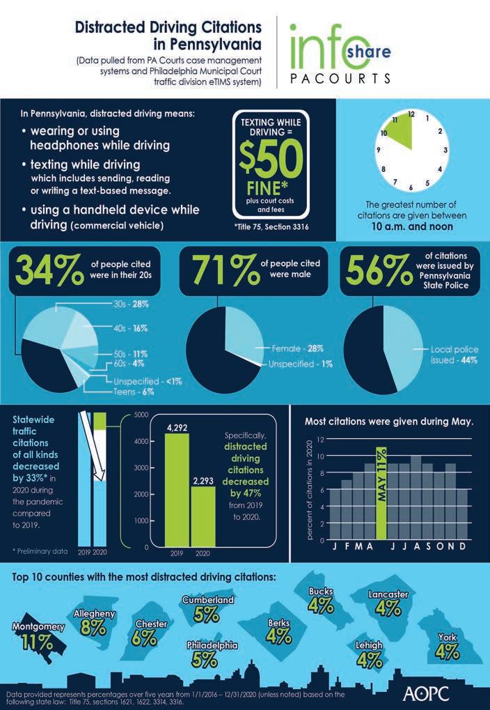 Overall traffic citations in Pennsylvania decreased by 33 percent in 2020 during the pandemic compared to 2019. Specifically, distracted-driving citations decreased by 47 percent statewide from 2019 to 2020.