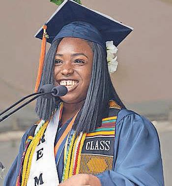 Valedictorian Prisca C. Obidike, whose parents traveled from Nigeria to hear their daughter speak, gave a valedictory address with a message of persistence. The biology major told graduates she had a rough start in one of her introductory biomedical research courses and almost dropped the course.