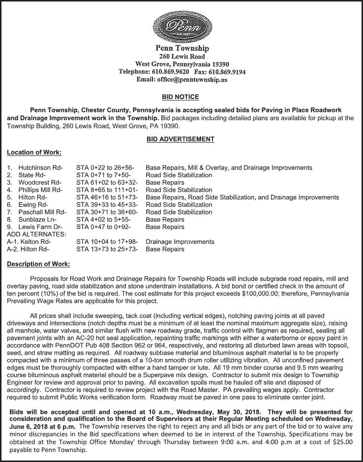 She said that there has been growing speculation that the increase in incidents along Inniscrone Drive is due to the closing of State Street Bridge – between Indian Road and Avondale Borough -- which has turned the road into a “cut-through lane” for drivers who need to get from State Road to East Avondale Road and Clay Creek Road. In the April progress report compiled by the township’s Public Works Department, the bridge is expected to be completed by May 25.