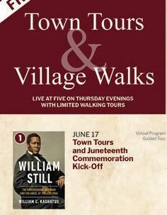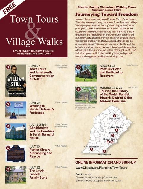 Kick Off of Town Tours and Village Walks, West Chester. Led by the Chester County Planning Commission, Chester County Historic Preservation Network, and the West Chester Historical Commission. A virtual “Live at 5” program will feature author William Kashatus. At 6:45 p.m., walking tours that focus on African American history in West Chester and a book signing by Mr. Kashatus will be held at Chester County History Center. Chester County History Center, 225 North High Street. To learn more, visit https://chescoplanning.org/ HisResources/TownTours. cfm
