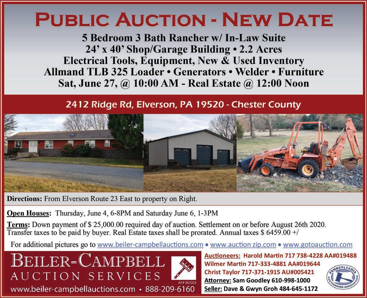 N.B. Ten percent (10%) of the purchase money must be paid at the time and place of sale. Payment must be paid in cash, certified check, or money order made payable to the purchaser or “Sheriff of Chester County”. The balance must be made payable to “Sheriff of Chester County” within twenty-one (21) days from the date of sale by 4PM. FREDDA L. MADDOX, SHERIFF 5p-27-3t Sheriff Sale of Real Estate By virtue of the within mentioned writs directed to Sheriff Fredda L. Maddox, the herein-described real estate will be sold at public sale in the Chester County Justice Center at 201 W Market Street, 3rd Floor, Room 3300, West Chester, Pennsylvania, as announced on Thursday, June 18th, 2020