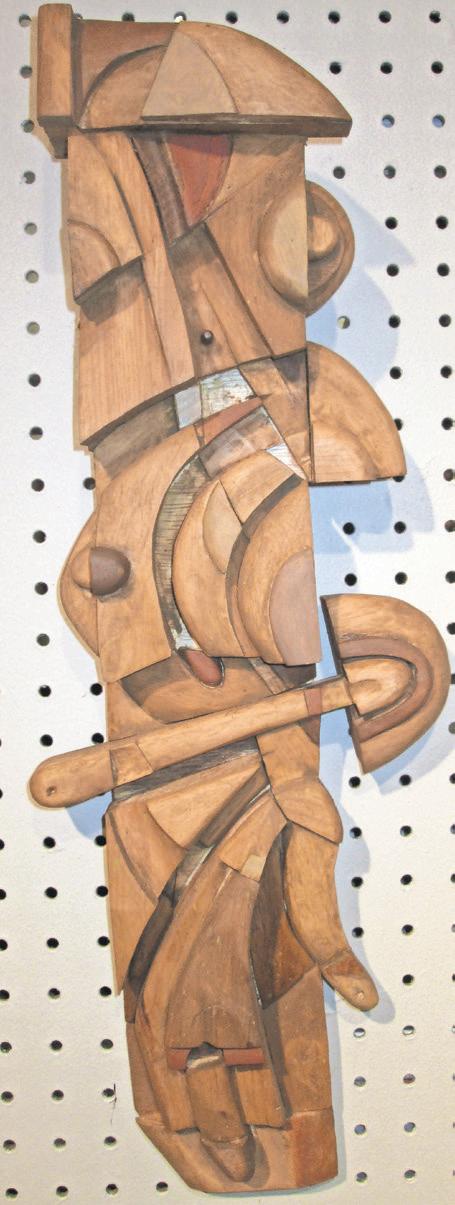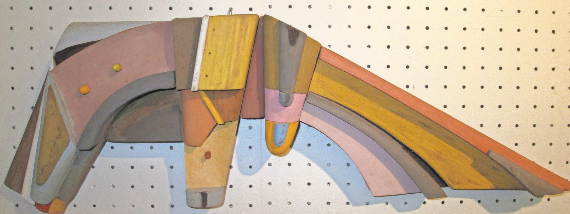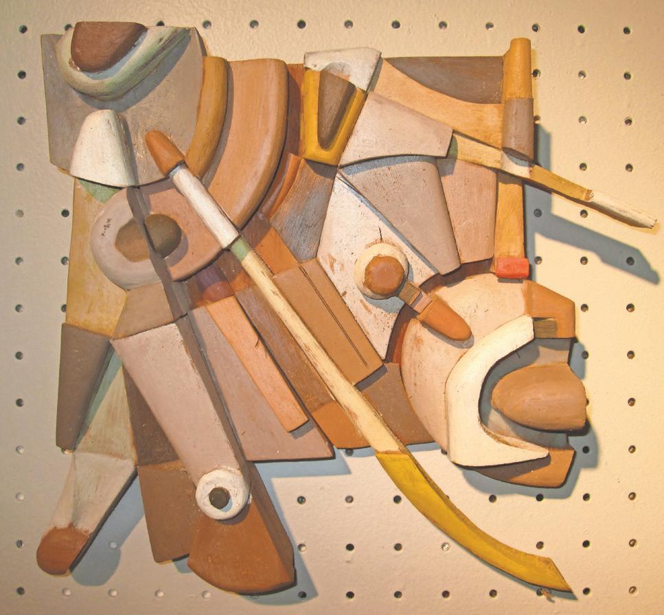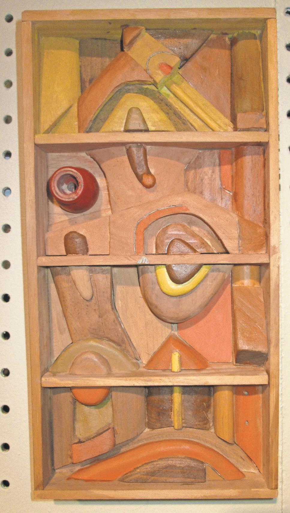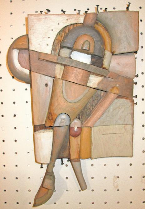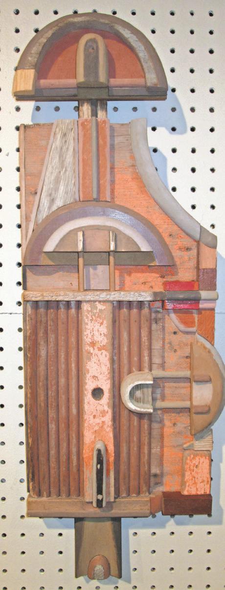 Each one is a dazzlingly complicated symphony of shapes. Each piece is cut by Miller and assembled –sometimes over months of careful thought – into objects that look both antique and modern, suggesting (among other things) city streets, little landscapes, people, architecture and puzzling machines whose purpose has been lost in time. The pastelhued paint that’s thoughtfully applied to some pieces accents aspects of the composition