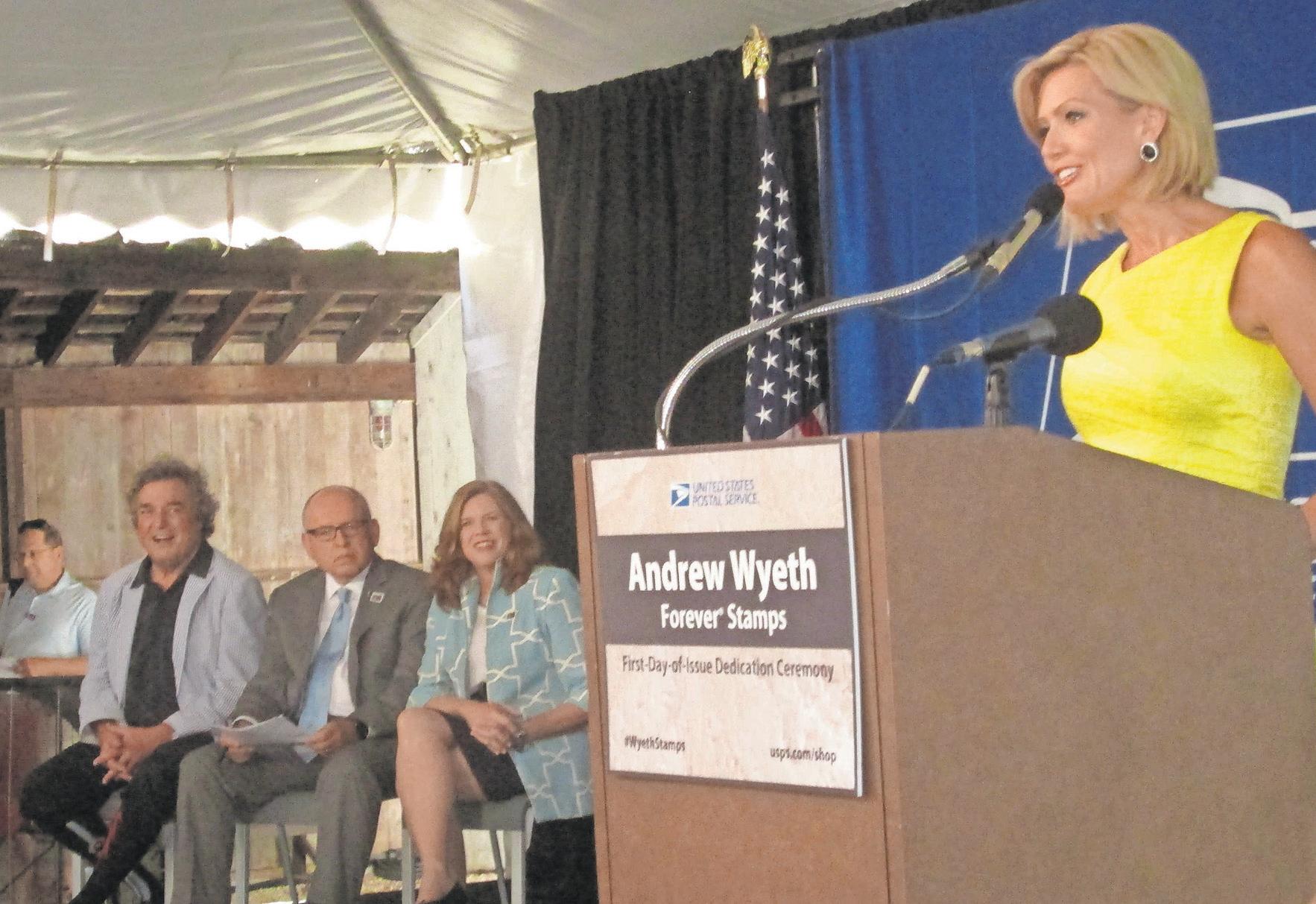 Cecily Tynan introduces Wyeth and other guests at the stamp dedication.