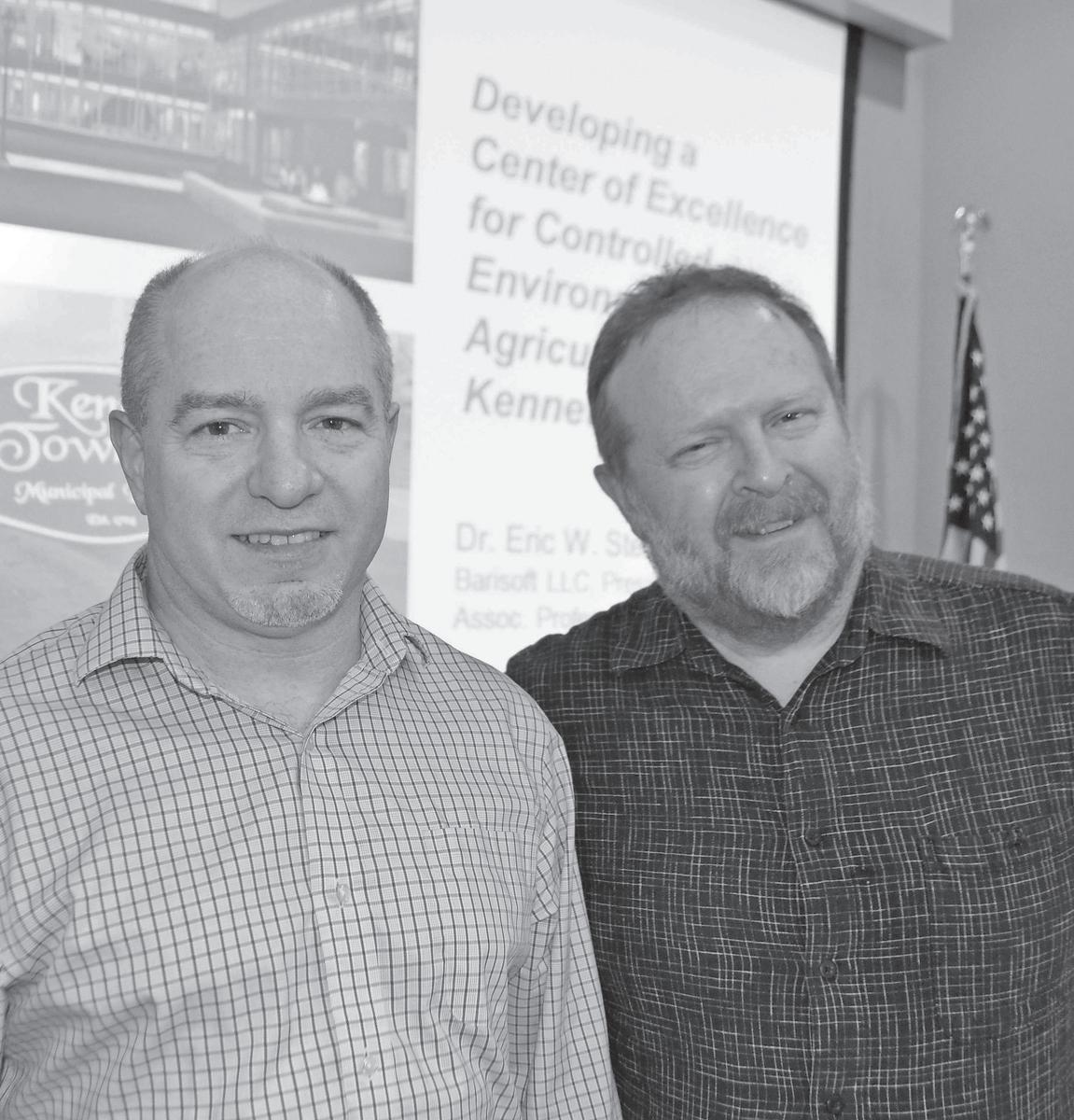 Penn State professor Eric Stein, left, introduced by Kennett Township grants program and environmental sustainability director Michael Guttman, gave a presentation at the New Garden Township Board of Supervisors meeting on July 17 that introduced plans to make the Kennett Square area into a world-wide hub for indoor agriculture.