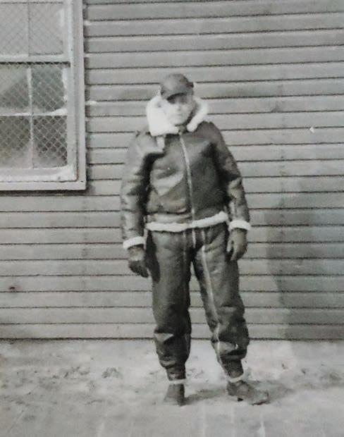 Bob Adams is wearing a sheepskin suit standing outside of his barracks in Nebraska. It was cold