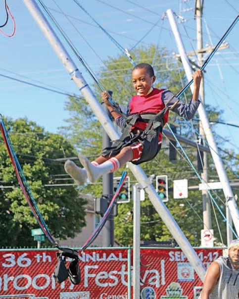 room eating contest after he consumed five-and-a-half pounds of mushrooms in eight minutes. Gone were the rides for children from previous years, but they were replaced at the southwest corner in a roughly established corral with bouncing tents and a tall bungee jumper. Throughout Saturday and Sunday there were lectures on the nutrition and the cooking of mushrooms, and there were also musicians playing on the stage.