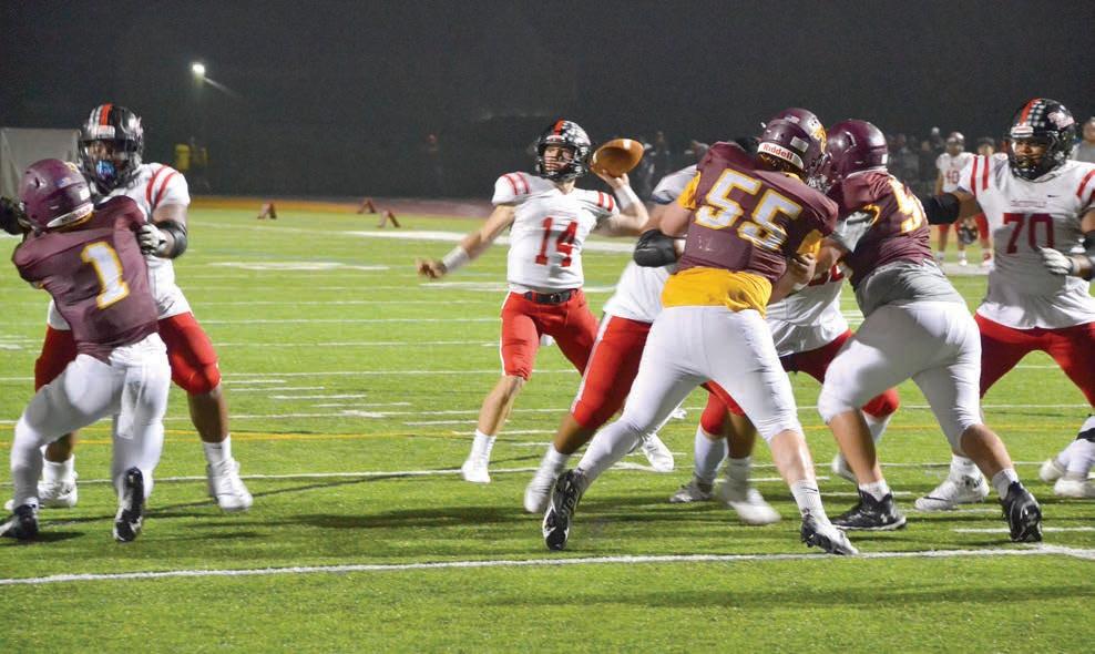 For the Avon Grove Red Devil football team, the fog never went away, and neither did Red Raider wide receiver Lebron Bessick, who scored three touchdowns in Coatesville’s 35-0 dismantling of Avon Grove on Sept. 17 in Ches-Mont National Division play. Both teams struggled through a scoreless and mistake-filled first quarter that saw neither team able to latch onto a sustaining drive. On Avon Grove’s first possession on their own 27 yard line, quarterback Connor Walsh fired a strike to Owen Yoder that was caught, fumbled and gathered in by Coatesville defensive back Spencer Ferguson at the 40. On third and 15 near midfield, however, Avon Grove defensive back Cooper McDannald intercepted a Harry Susi pass with 10:15