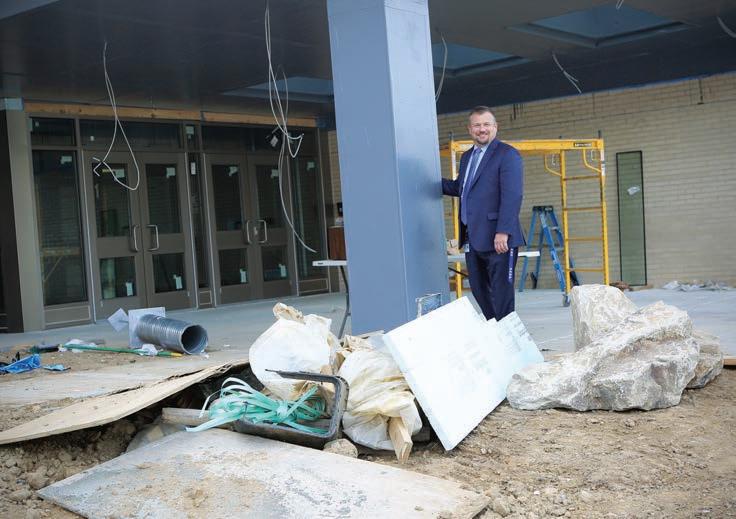 George Wolhafe stands amid building materials at the façade of Mary D. Lang Kindergarten Center. He is predicting the end of October for the completion date.